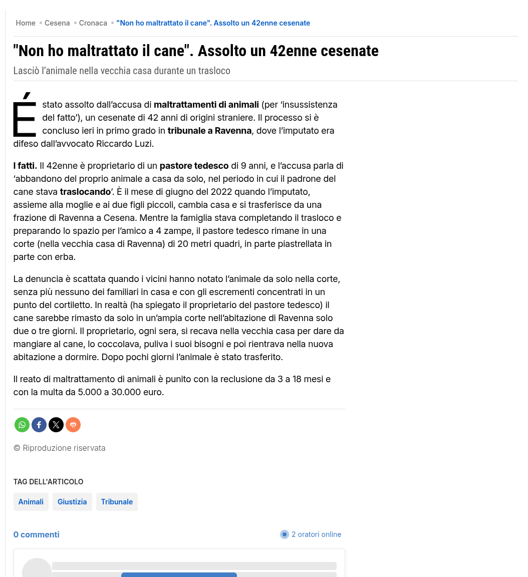 “Non ho maltrattato il cane”. Assolto un 42enne cesenate